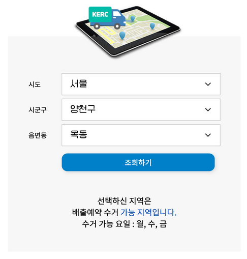 해당지역 목록 없는 경우 고객센터(1599-0903)으로 문의 하시고, 지역별 수거 가능 요일 확인 하시기 바랍니다.
