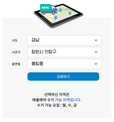 해당지역 목록 없는 경우 고객센터(1599-0903)으로 문의 하시고, 지역별 수거 가능 요일 확인 하시기 바랍니다.